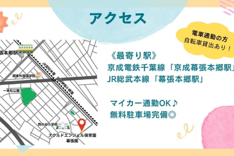 京成千葉線 京成幕張駅 京成電鉄千葉線「京成幕張本郷駅」より徒歩14分 JR総武本線「幕張本郷駅」より徒歩15分 電車通勤の方・・・会社から自転車貸出あり 幕張駅or幕張本郷駅にて利用可 ※駅前駐輪場確保 マイカー通勤OK/無料駐車場完備◎