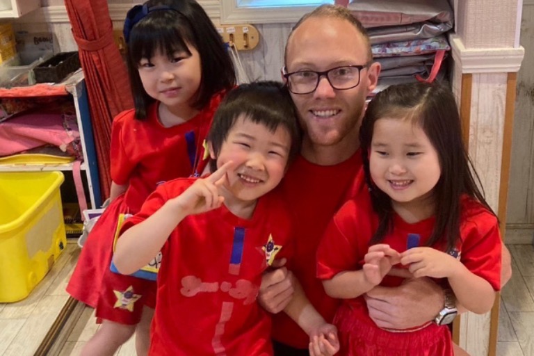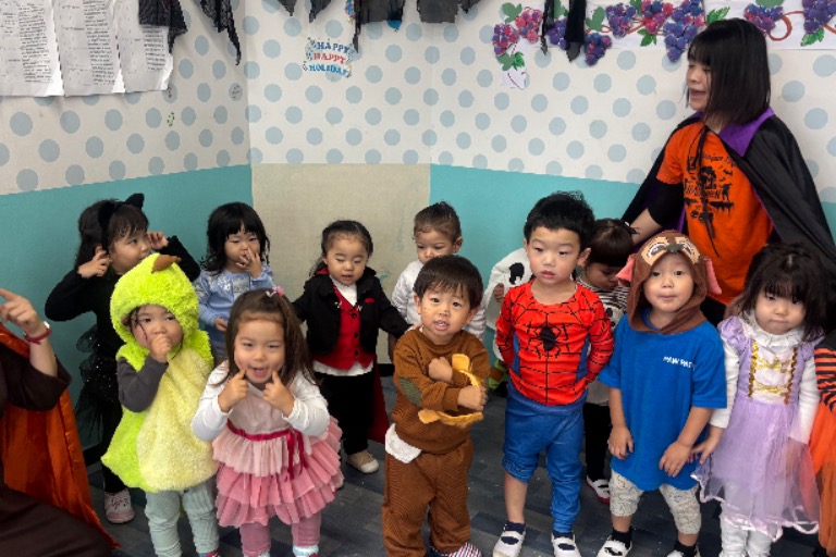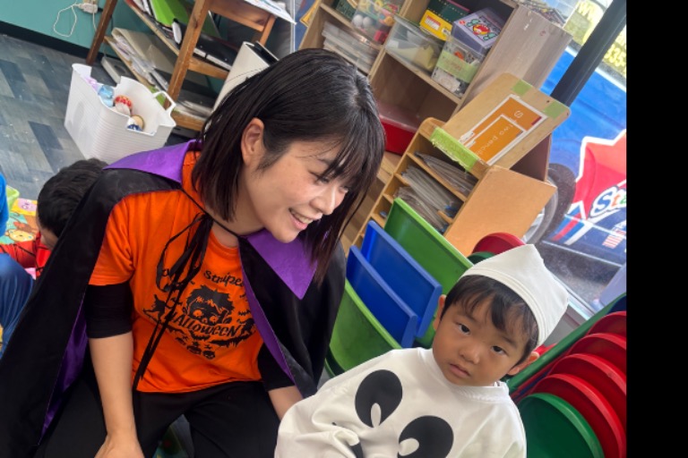 ネイティブの先生と共にお遊戯をしたり遊んだりして育てていただくお仕事です。
