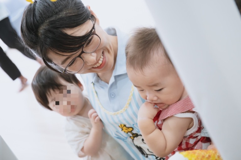 「育ち合うクラスづくり(乳児期から幼児期に向けての途切れない保育)」をビジョンに掲げ、乳児期は「にっこり・ゆったり」を土台に保育に対する価値観を共有し合い、柔軟な保育をするように心がけています。