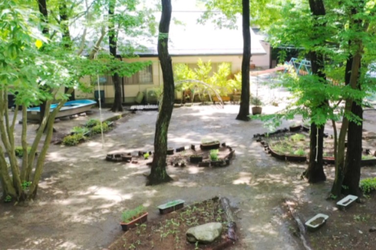 木々に囲まれた林の中で、自然の息吹を感じながら四季の変化に身をゆだね、子どもと大人が一つの空間の中でお互いを大切にしながら生活をしています。