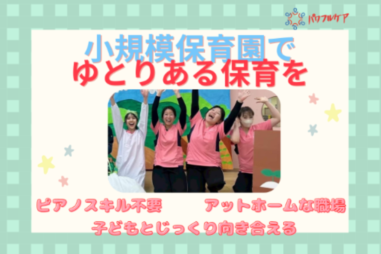 ・0歳~2歳児の保育業務全般 ・子どもたちの身の回りのお世話 ・日々の遊びや活動のサポート 季節の製作や行事準備 年齢や成長に合わせた活動の工夫 ・保護者とのコミュニケーション ・書類対応 ・園内清掃・環境整備など 少人数保育なので、職員みんなで協力して 子どもを見守ります。 子どもたちの生活習慣を身に着けるお手伝いをしていただきます。 天気が良い日は戸外へ出かけることが多いです! ◎担当制保育もしていますよ。 ◎持ち帰り仕事は推奨していません! ◎ピアノも弾きません。(苦手な人でも大丈夫!) |