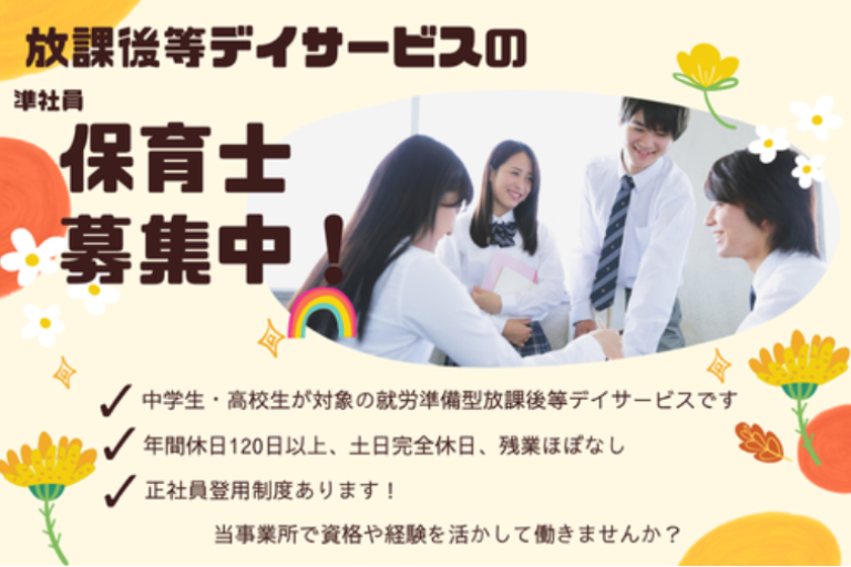 | 仕事 内容 | ============================== ⏩障がいのある中学生・高校生を対象に就労へ向けたスキルを 身につけられるようサポートをするお仕事です⏪ ✅パソコン指導(データ入力、文書入力、コピー&ペースト等) ✅実務訓練(ピッキング、重さの計量、接客マナー、 ビジネスマナー、SST等) ✅送迎業務(社用車使用/ワンボックス車) ✅日報作成 等 ※生徒への指導は1か月ごとのプログラムに沿って行っていただきます。 ※スタッフ6名での集団療育となります。 ============================== |