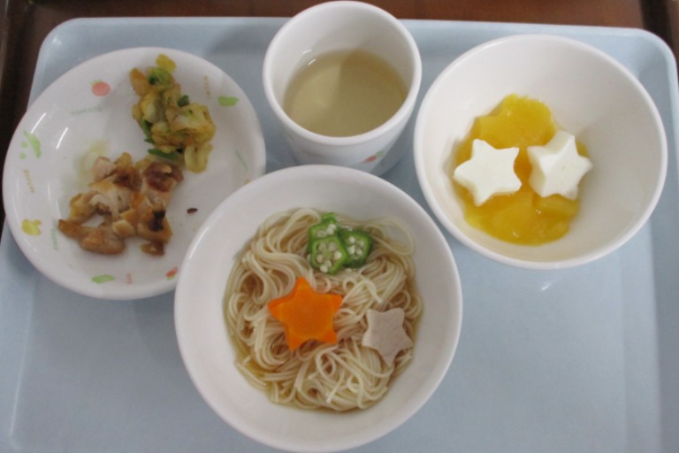 献立に使う食材の下ごしらえ(主食、主菜、副菜、汁物、オヤツ:パン、麺類、ご飯類、デザート系)、調理(普通食、離乳食、アレルギー食、オヤツづくり)、各クラス別に食器の準備と配膳、使用済みの道具、食器等の洗浄と片付け、清掃を分担して行います。上記の作業を、簡単なものから慣れ具合に応じて増やしていきます。 |