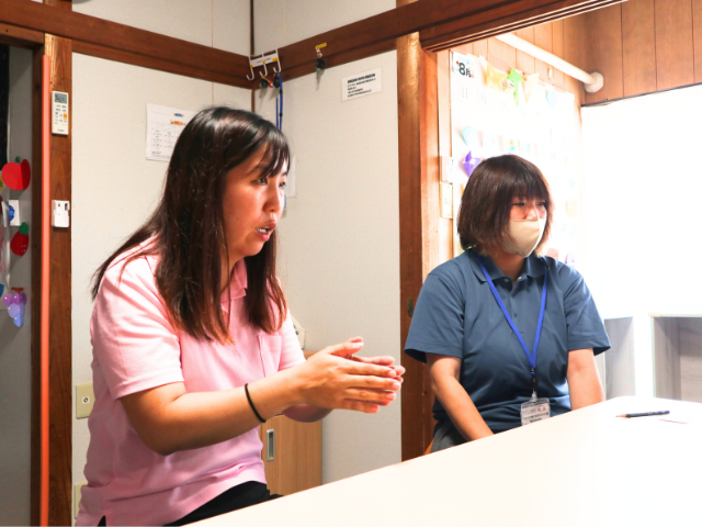坂本さん:入職したばかりですが、子どもに対して温かく接しており、職員と子どもの距離が近く感じます。子どもは「○○先生」ではなく「○○さん」など、さん付けで職員を呼んでいるのも、距離が縮まる感じがして良いと思いました。しっかりとダメなことはダメと教えますが、楽しむときはみんなで楽しみます。この前も、他の事業所と合同で夏祭りを開催して楽しかったです!